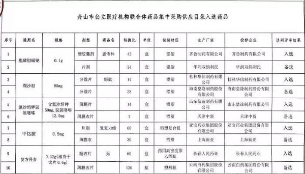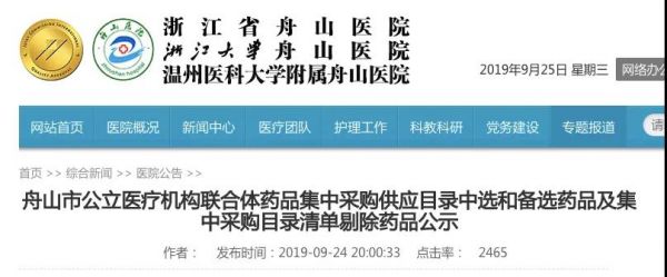 近日,浙江省舟山医院官网发布《舟山市公立医疗机构联合体药品集中采购供应目录中选和备选药品及集中采购目录清单剔除药品公示》。