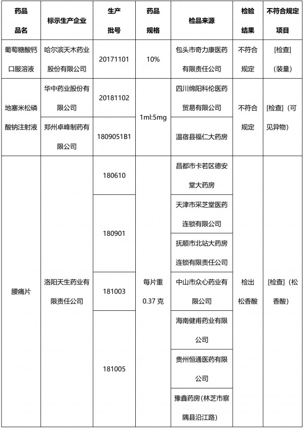 经上海市食品药品检验所检验,标示为洛阳天生药业有限责任公司生产的4批次腰痛片检出松香酸。