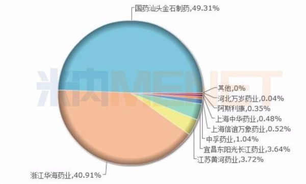 据米内网数据显示,2018年中国公立医疗机构终端,赖诺普利片的销售额为2309万元,国药汕头金石制药与华海药业市场份额均超过40%。