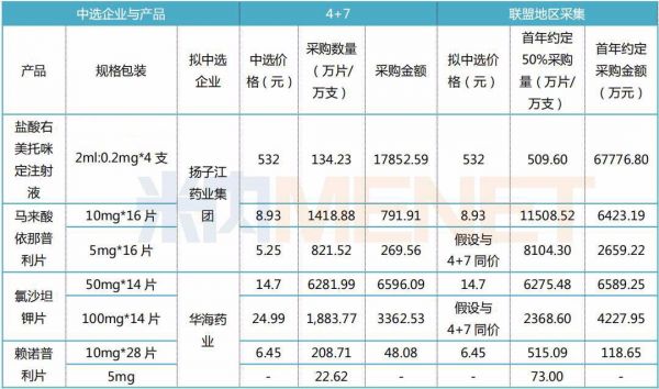 表1:4+7中选及联盟地区药品集中采购拟中选情况