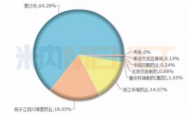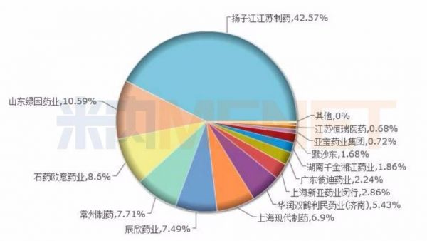 从市场格局来看,领军企业扬子江江苏制药的市场为42.57%,遥遥领先于石药欧意药业、常州制药、辰欣药业。