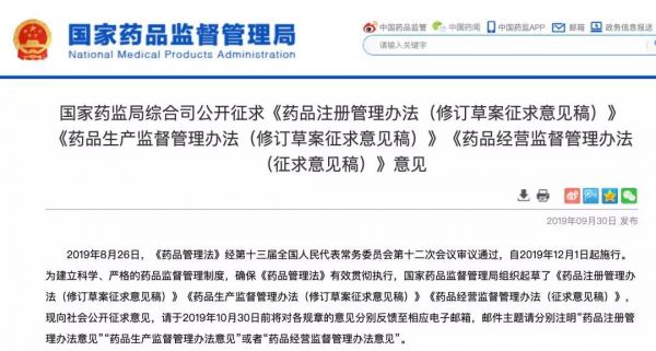 9月30日,国家药品监督管理局官网对药品注册、生产、经营三个规章公开征求意见。三个规章分别为:《药品注册管理办法(修订草案征求意见稿)》《药品生产监督管理办法(修订草案征求意见稿)》《药品经营监督管理办法(征求意见稿)》。