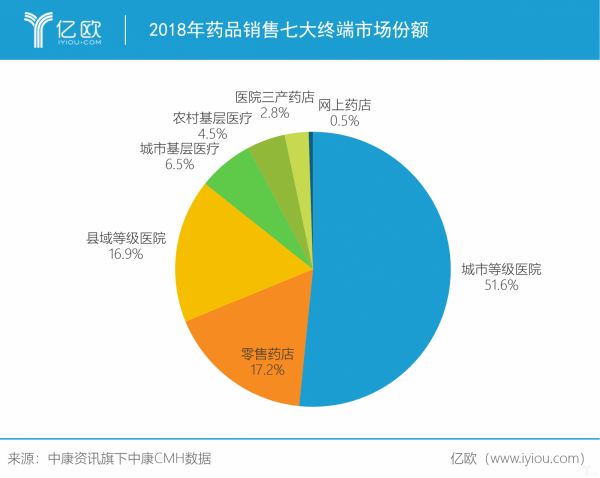 根据中康资讯旗下中康CMH数据,2018年,我国七大终端药品销售额达到1.67万亿元,城市公立医院为销售最大的阵地,占据了市场一半的销售份额。不过,城市公立医院市场的销售额增速有放缓趋势,而随着分级诊疗、医药分家、处方外流等政策引导,基层医疗、零售药店市场份额正逐步提高。