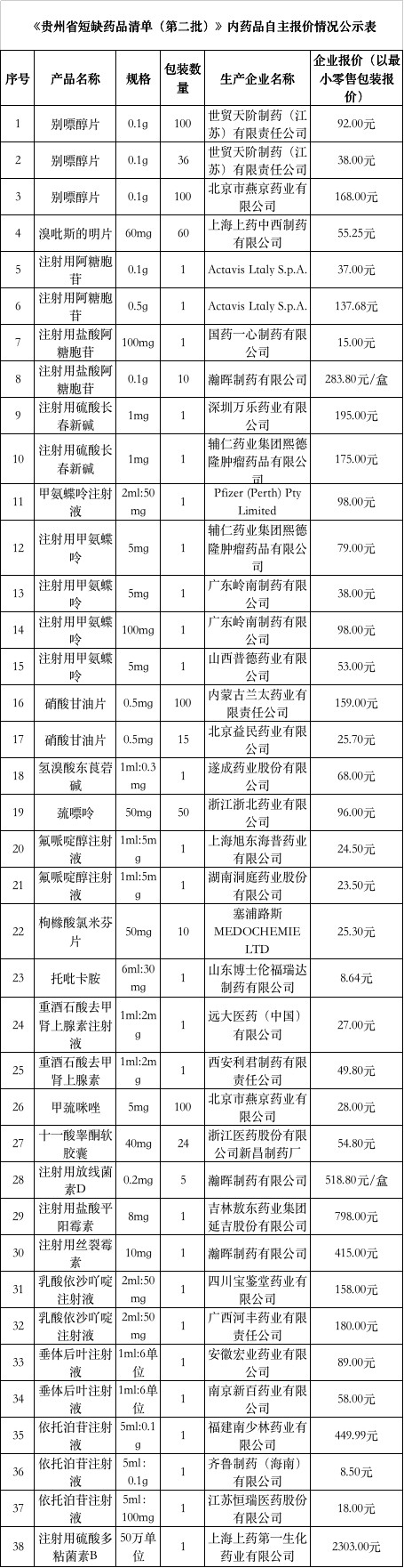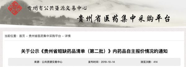 10月14日,贵州省医药集中采购平台发布《贵州省短缺药品清单(第二批)》内药品自主报价情况的通知》(以下简称《通知》)。