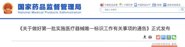 10月15日,国家药监局官网发布通知,《关于做好第一批实施医疗器械唯一标识工作有关事项的通告》正式发布。