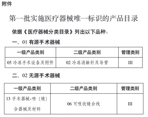 品种范围上:按照风险程度和监管需要,确定部分有源植入类、无源植入类等高风险第三类医疗器械作为第一批医疗器械唯一标识实施品种。