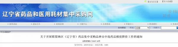 10月22日,辽宁省药品和医用耗材集中采购网发布《关于开展联盟地区(辽宁省)药品集中采购品种未中选药品梯度降价工作的通知》(简称《通知》),要求按照国家政策相关规定,就联盟地区(辽宁省)药品集中采购品种未中选药品展开梯度降价工作。