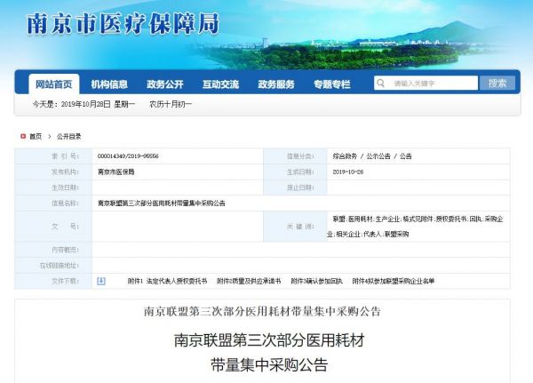 10月26日,江苏省南京市医保局发布《南京联盟第三次部分医用耗材带量集中采购公告》(下称《公告》)。