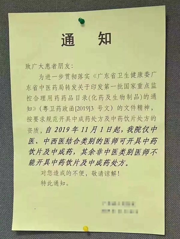 这家医院通知患者:自2019年11月1日起,我院仅中医、中西医结合类别的医师才可以开具中药饮片及中成药,其余非中医类别医师不能开具中药饮片及中成药。