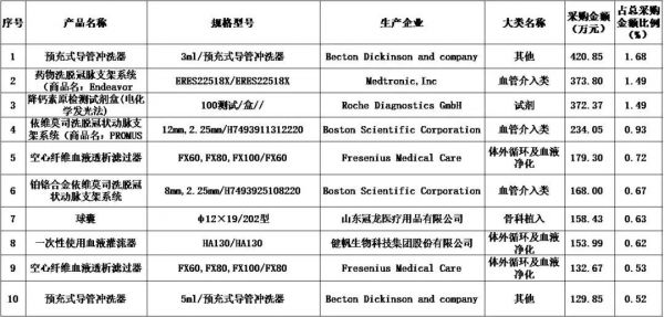 据了解,前10名医用耗材合计采购金额为2323.32万元,占医用耗材总采购金额9.28%,其中BD的预充使导管冲洗器和美敦力的药物洗脱冠脉支架系统位列采购前两名。