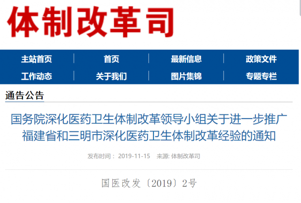 11月15日,国家卫健委体制改革司发布《国务院深化医药卫生体制改革领导小组关于进一步推广福建省和三明市深化医药卫生体制改革经验的通知》。文件提到2020年,按照国家统一部署,扩大国家组织集中采购和使用药品品种范围。