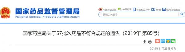 11月26日,国家药监局发布了2019年 第85号药品不符合规定的通告。通告称,经苏州市药品检验检测研究中心等11家药品检验机构检验,标示为康普药业股份有限公司等40家企业生产的57批次药品不符合规定。