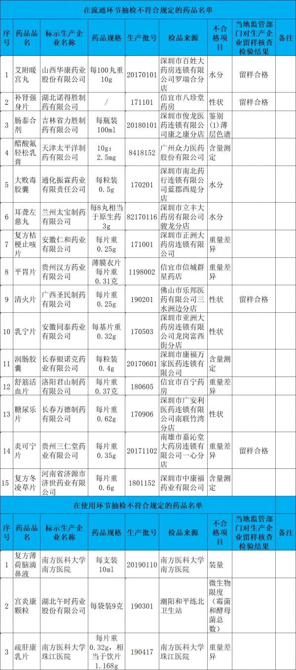 值得注意的是,艾附暖宫丸(山西华康)、补肾强身片(湖北诺得胜)、清火片(广西圣民)、炎可宁片(贵州三仁堂)等4个药经当地监管部门对生产企业留样核查检验合格,这也表示,这4个药生产不存在问题,有可能是经营企业流通、存储、养护出现问题了。