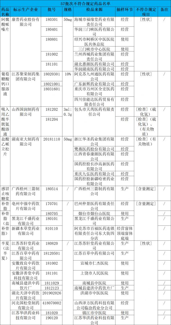 梳理发现,57批次不合格药品中,有11批次为制剂,46批次为中药饮片。值得注意的是,这其中包括两个OTC,为葡萄糖酸钙口服溶液、感冒止咳糖浆;3个处方药,分别为阿魏酸哌嗪片、吸入用乙酰半胱氨酸溶液、盐酸乙哌立松片。