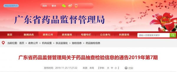 11月25日,广东省药监局公布了2019年第7期药品抽查检验信息的通告。通告称,2019年6月,全省共抽查检验64个药品生产企业、499个药品经营企业和154个医疗机构的716个品种共1607批次药品。