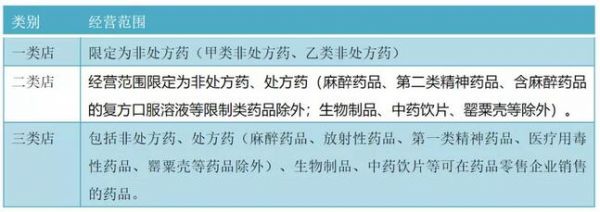 《办法》指出,根据企业设置条件与药品经营范围、经营规模的适应程度,核定的经营范围从小到大分为一类、二类和三类,相对应的企业分别简称为一类店、二类店和三类店。具体如下: