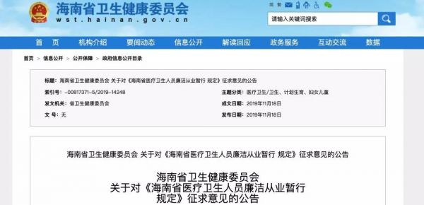 近日,海南省卫健委发布“关于对《海南省医疗卫生人员廉洁从业暂行规定》征求意见的公告”(以下简称暂行规定),为加强医疗卫生人员的廉政作风建设,进行了一系列规定和惩治措施。