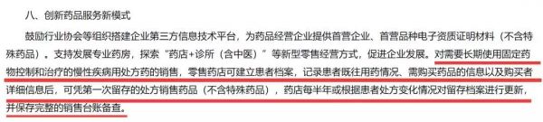 其中,《意见》第8项“创新药品服务新模式”明确,“对需要长期使用固定药物控制和治疗的慢性疾病用处方药的销售,零售药店可建立患者档案,记录患者既往用药情况、需购买药品的信息以及购买者详细信息后,可凭第一次留存的处方销售药品(不含特殊药品),药店每半年或根据患者处方变化情况对留存档案进行更新,并保存完整的销售台账备查。”