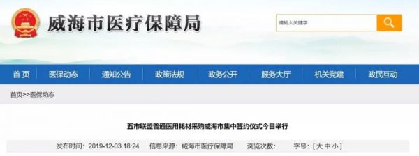 12月3日,山东省威海市医保局发布消息称,近期青岛、淄博、烟台、潍坊、威海五市采购联盟组织开展了耗材集中带量采购工作,对输液器、留置针、预冲式导管冲洗器三大类19个品规普通医用耗材进行谈判议价。