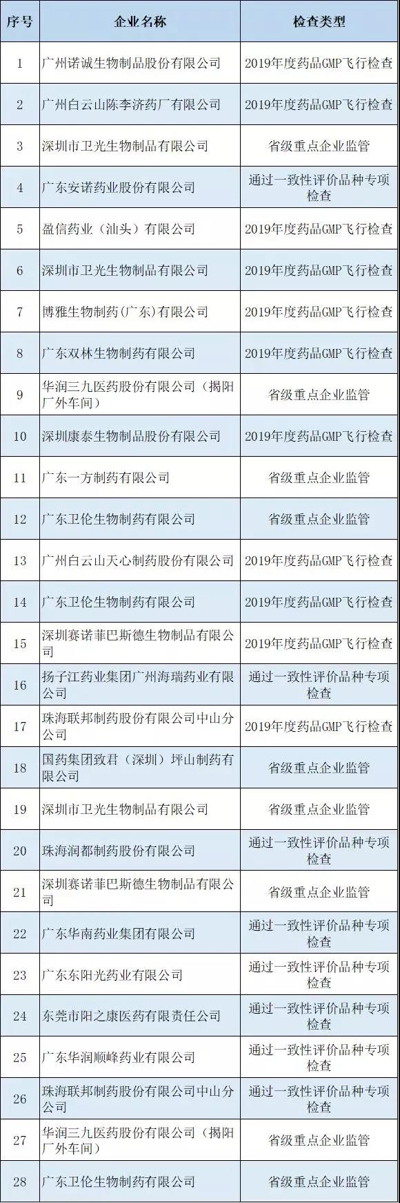 12月12日,广东省药监局发布药品生产安全监管检查通报,检查分为2019年度药品GMP飞行检查、通过一致性评价品种专项检查和省级重点企业监管三种类型:2019年度药品GMP飞行检查的11家;省级重点企业监管检查9家;通过一致性评价品种专项检查8家;检查涉及白云山、一方、珠海联邦等21家药企,检查均未发现违法违规行为。