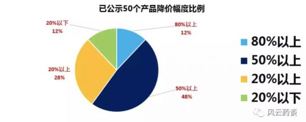 据风云药谈统计,已公示50个产品,均降幅较大,近12%的产品降幅在80%以上,48%的药品在50-80%之间。