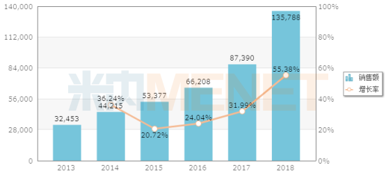 硼替佐米是新型靶向抗癌药,主要用于治疗多发性骨髓瘤及被套细胞淋巴瘤。米内网数据显示,2018年在中国城市公立医院、县级公立医院、城市社区中心及乡镇卫生院(简称中国公立医疗机构)终端硼替佐米注射剂销售额超过13亿元,同比增长55.38%。