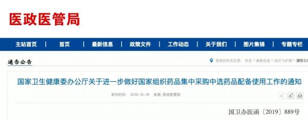 12月19日,国家卫健委发布《关于进一步做好国家组织药品集中采购中选药品配备使用工作的通知》(以下简称《通知》)。