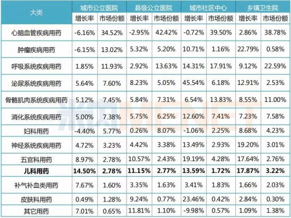 细分到各市场,儿科用药因为患者群体的特殊性,在城市公立医院、县级公立医院、城市社区中心、乡镇卫生院各市场中的份额占比在2%~3%左右,但销售增速均超过10%,表现十分亮眼。