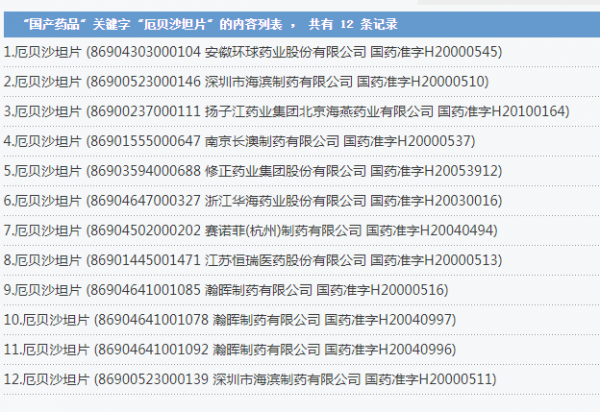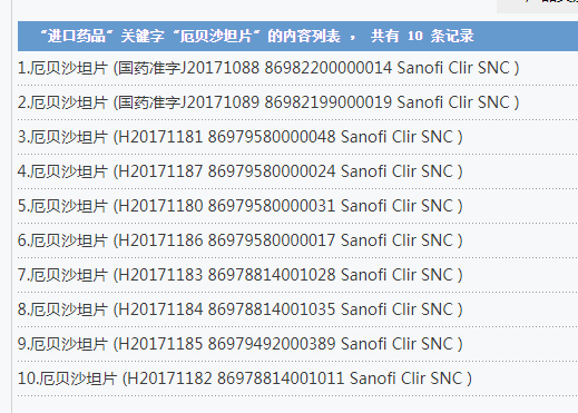 笔者查询国家药品监督管理局-数据查询中检索“厄贝沙坦片”发现国产有12个品规(见附图),进口产品10个品规(见附图)。
