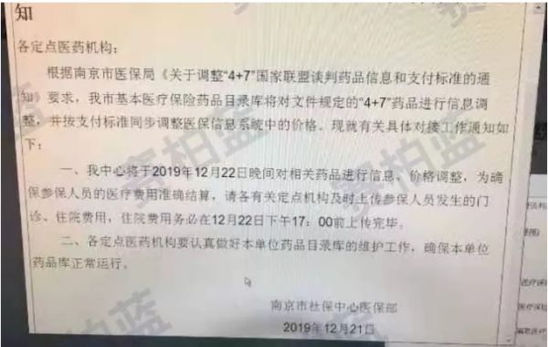 方案明确指出:2019年12月31日前全面执行国家试点扩围结果和各项配套政策。其实早在12月21日南京市社保中心医保部已经发文给各定点医疗机构,文中称“我中心将于2019年12月22日晚间对相关药品信息、价格调整,为确保参保人员的医疗费用精确结算,请各有关定点机构及时上传参保人员发生的门诊、住院费用,住院费用务必在12月22日下午17.00前上传完毕”