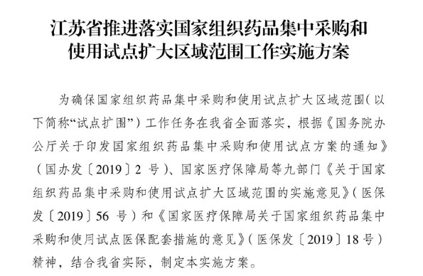 2019年12月23日,江苏省医疗保障局,江苏省药品监督管理局等九部门联合发文“江苏省推进落实国家组织集中药品采购和使用试点扩大区域范围工作实施方案”