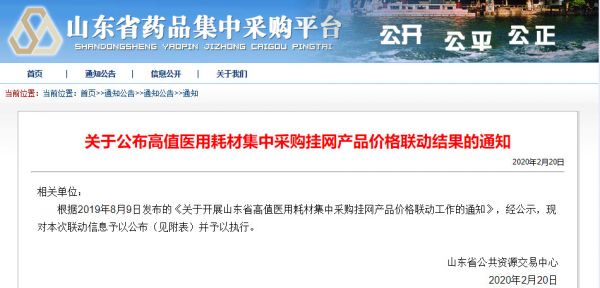 2月20日,山东省药品集中采购平台发布了《关于公布高值医用耗材集中采购挂网产品价格联动结果的通知》(以下简称《通知》)。