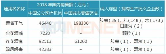 从2018年国内销售额(含中国公立医疗机构终端及城市零售药店终端销售额)看,藿香正气类药品合计销售额约24亿元,其中零售药店销售占比高,太极集团重庆涪陵制药占主导地位;以岭药业的连花清瘟合计销售额超过15亿元,医疗机构销售占比略高于零售药店。