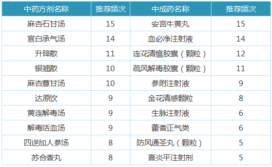 经统计,地方版诊疗方案中具有明确名称的中药方剂共40种,中成药共32种,按照推荐频率排序,中药方剂中5个推荐频次超10次,麻杏石甘汤推荐频次最高,其次是宣白承气汤和升降散;中成药中4个推荐频次超10次,安宫牛黄丸推荐频次最高,其次为血必净注射液和连花清瘟胶囊(颗粒)。