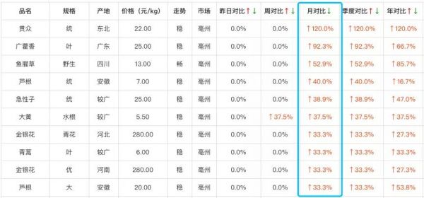 根据药通网数据显示,从全国最大的中药材市场——亳州市场的中药材价格走势情况来看,近一个月有不少中药材价格上涨,包括贯众、广藿香、鱼腥草、芦根等等,涨幅最高达到120%。