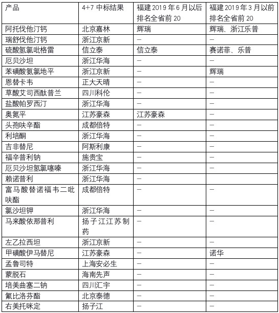 从每月top20的数据显示,只有江苏豪森在2019年4+7启动以后该通用名产品新进入福建的省前20。原有在名单前列的产品如氨氯地平4+7以后没有在前20的榜单出现过。氯吡格雷在榜单上但是换了中标的厂家。