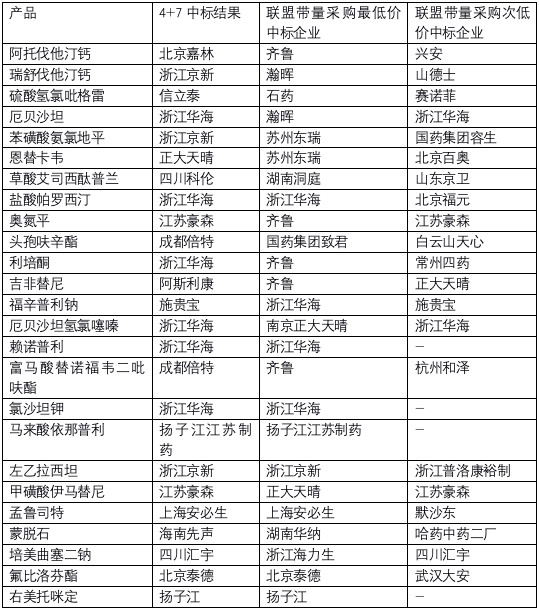 瑞舒伐他汀钙、厄贝沙坦和苯磺酸氨氯地平沿用了“4+7“中选结果。这三个产品对应的联盟扩面中标厂家都没出现过的《未中选药品梯度降级结果》。