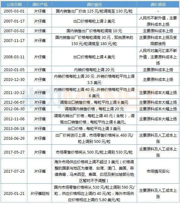 漳州片仔癀药业自2003年6月登陆A股,上市至今快有17个年头。2005年3月1日发布的调价公告中,片仔癀国内销售出厂价由125元/粒调高至130元/粒;2020年1月21日公告称,片仔癀锭剂国内市场零售价格将从530元/粒上调到590元/粒,海外市场供应价格相应上调约5.80美元/粒。15年间,片仔癀调价16次,其中国内价格调整11次,调价的原因大多为原料涨价。
