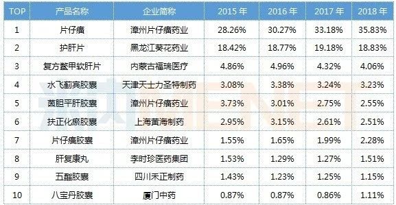米内网数据显示,在中国城市零售药店终端中成药肝炎用药市场中,片仔癀一直高居榜首,2016年起市场份额超过30%,2018年涨至35.83%;第二名是葵花药业的护肝片,最近四年的市场份额接近20%左右;TOP3至TOP10品牌的市场份额均不超过5%,片仔癀优势非常明显。