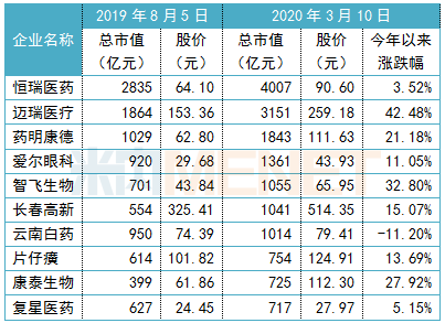 全球市场震荡,A股也受到了影响。3月9日,A股三大股指集体下跌,市场处于普跌状态,然而仁和药业、海王生物等口罩概念股逆市领涨。据统计,当日全球几大重要市场市值暴跌逾20万亿人民币。截至3月10日收盘,TOP10医药股市值均超700亿元,其中,恒瑞医药、迈瑞医疗、药明康德、长春高新、云南白药等7只市值超过千亿。
