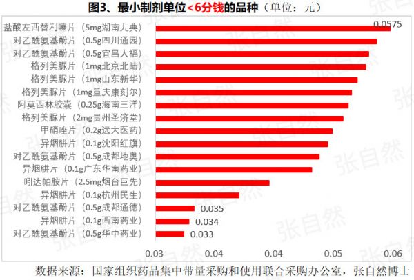 本次中选单价最小的是华中药业的对乙酰氨基酚片(0.5g),单价为3分钱(即0.033元/片)(图3),比4+7的0.148元/片(浙江京新的苯磺酸氨氯地平5mg)和4+7扩围的0.049元/片(齐鲁制药的利培酮1mg)又降低了很多,尤其低于6分/片的就有17个,比4+7及扩围的最低单价品种数量多出更多。