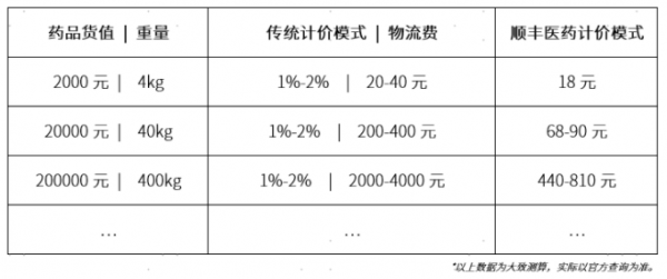 我们参考顺丰医药此前对外公布的数据,在医药物流方面,顺丰医药是灵活根据重量、体积等维度定价的第三方物流计价模式,无论货物多少,货价的高低,计价规则是一致的——按重量和尺寸的维度来报价。