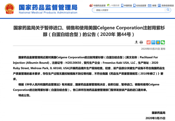 3月25日,国家药监局官网发布《关于暂停进口、销售和使用美国Celgene Corporation注射用紫杉醇(白蛋白结合型)的公告(2020年 第44号)》称,经过开展药品境外生产现场检查,该产品部分关键生产设施不符合我国药品生产质量管理的基本要求,存在生产过程无菌控制措施不到位等问题,不符合我国《药品生产质量管理规范(2010年修订)》要求。