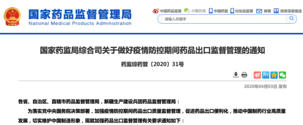 4月3日,国家药监局挂网《国家药监局综合司关于做好疫情防控期间药品出口监督管理的通知》(下称《通知》),对加强药品出口监督管理提出了相关要求。《通知》目的是在于落实党中央国务院决策部署,加强疫情防控期间药品出口质量监督管理,促进药品出口便利化,推动中国制药行业高质量发展,切实维护中国制造形象。