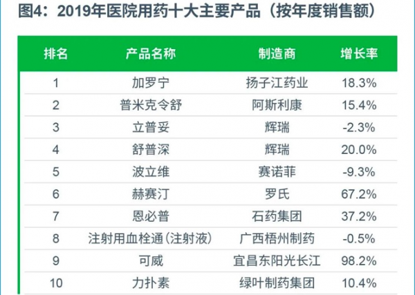 按销售额排序,2019年医院用药十大主要产品分别是加罗宁、普米克令舒、立普妥、舒普深、波立维、赫赛汀、恩必普、注射用血栓通(注射液)、可威、力扑素。