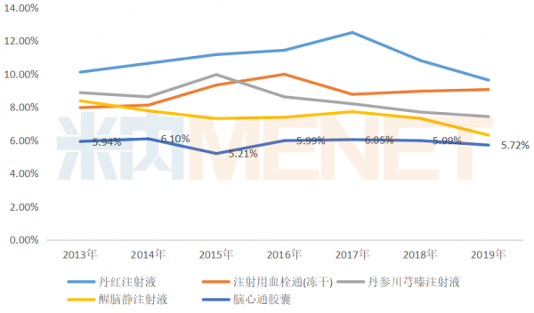 在米内网重点城市公立医院终端中成药脑血管疾病用药市场中,TOP5产品4个为注射剂,最近几年中药注射剂受医保限制、辅助用药等政策影响较大,市场份额下滑明显,脑心通胶囊作为口服制剂,受影响程度相对交少,市场份额保持在5%~6%左右。