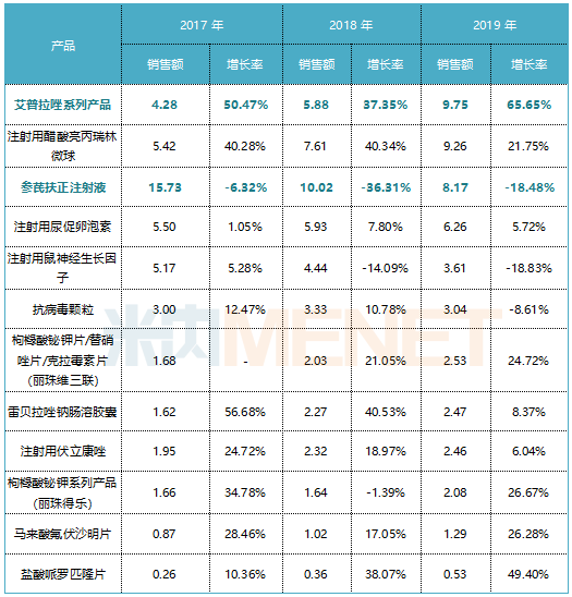 丽珠集团的重点产品艾普拉唑系列产品、注射用醋酸亮丙瑞林微球、枸橼酸铋钾片/替硝唑片/克拉霉素片(丽珠维三联)、枸橼酸铋钾系列产品(丽珠得乐)、马来酸氟伏沙明片、盐酸哌罗匹隆片2019年销售额增长率超过20%,其中艾普拉唑系列产品、注射用醋酸亮丙瑞林微球销售额涨至9亿元以上。