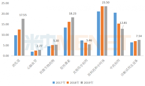 2019年丽珠集团制剂药业务共计实现销售收入62.13亿元,占公司总营业收入的66.20%。其中,化学制剂产品实现销售收入49.31亿元,同比增长16.35%。包括了消化道17.55亿元,心脑血管2.77亿元,抗微生物药物5.30亿元,促性激素18.23亿元,其他化学制剂5.46亿元。中药制剂产品实现销售收入12.81亿元,同比下降16.39%。