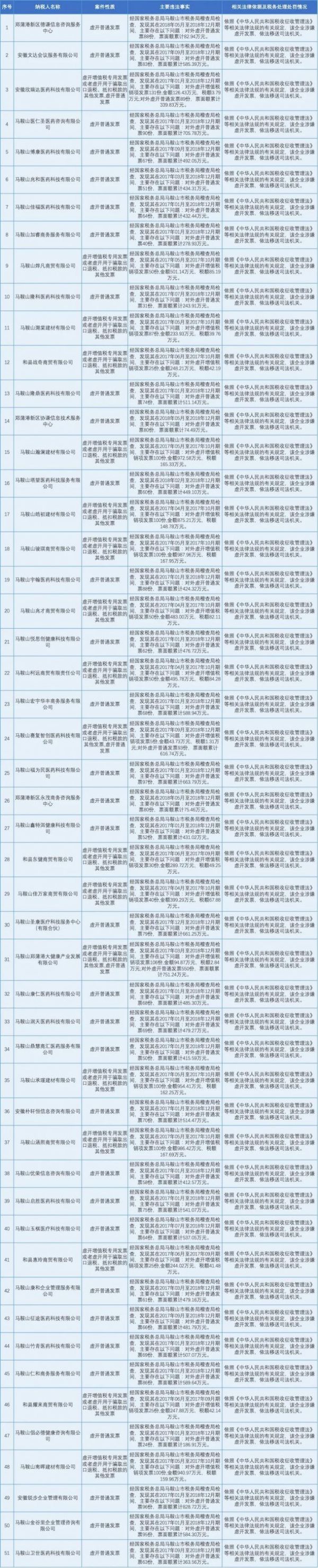 安徽省马鞍山市税务局日前发布《重大税收违法案件信息公告2020年3月》,此次公告内容共列出51家“重大税务违法”企业名称,可以看到,除少数商贸、建材类的企业之外,大部分均为医药服务类企业,案件性质则多为虚开增值税普通发票或专用发票。