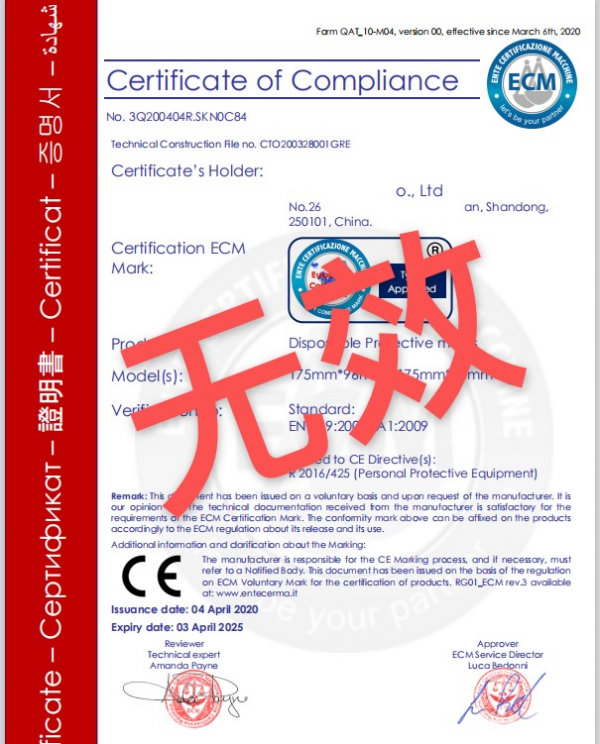 文件上均标注该公司的“ECM”标志及CE标志。经查明,ENTE CERTIFICAZIONE MACCHINE SRL在(EU)2016/425(PPE)领域并非获得授权的公告机构,不能对个人防护口罩进行CE认证。